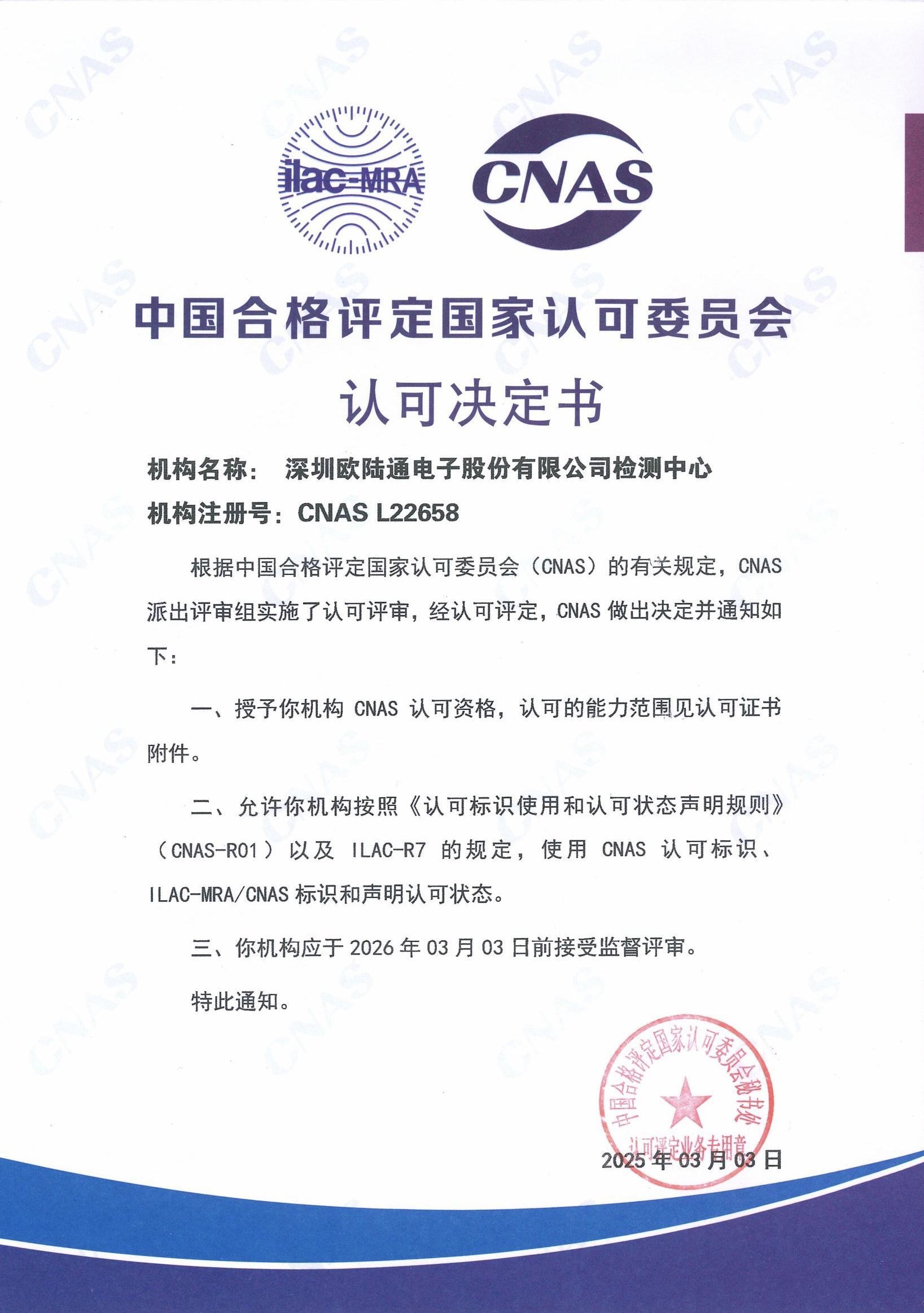 近日,歐陸通實驗室順利通過了中國合格評定國家認可委員會(CNAS)資質(zhì)評審及合格評定,榮獲國家級CNAS實驗室認可證書,標志著公司實驗室的測試能力與管理體系已達到國際互認水平,檢測報告和結(jié)果可實現(xiàn)在全球上百個國家和地區(qū)的互信認可。